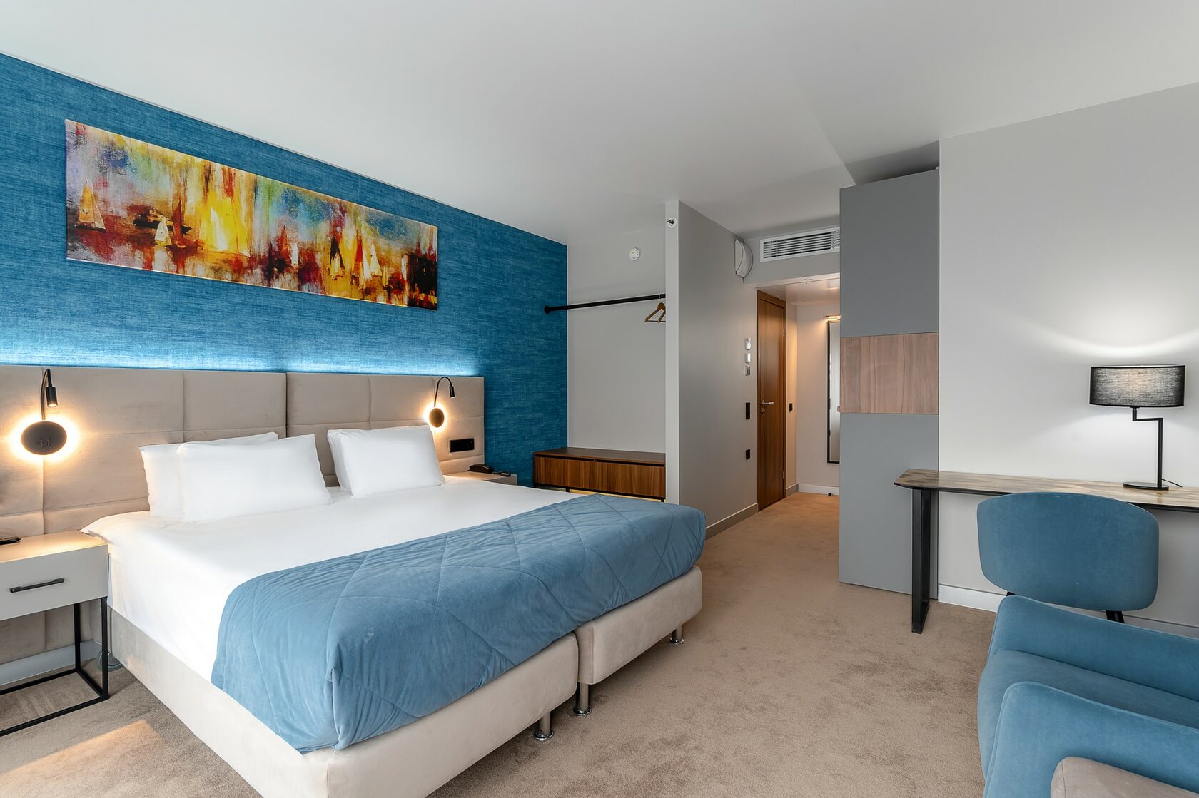 디럭스 트윈 롬에서 더블 침대 1 개와 객실 내 전용 욕실이 있습니다.마당과 시내 전망. 롬 사이즈25 미터. 최대 숙박 가능 인원은 2 명입니다. 객실에는 에어컨, 케이블 TV, 주전자, 냉장고, 책상, 의자,옷장, 침대 옆 탁자, 램프, 헤어 드라이어, 무료 세면 용품, 슬리퍼, 타월이 있습니다.